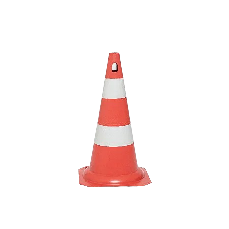 injetado em PP (polipropileno) numa única peça (corpo e faixas) nas cores laranja com branco. Resistente às intempéries climáticas. Possui duas faixas brancas não refletivas injetadas no corpo do cone. Conta com um orifício no topo para o encaixe de “porta-tudo” (vendido separadamente) e duas aberturas laterais na parte superior para o uso de fita zebrada, corrente ou corda.