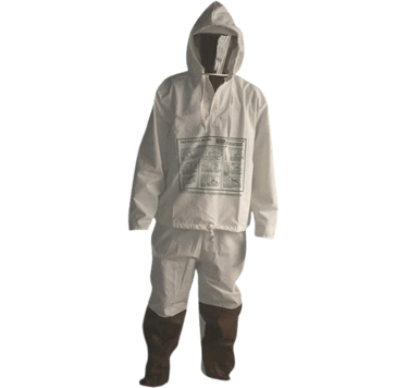 Vestimenta de segurança de corpo inteiro, composta de calça tipo pijama com reforço impermeável nas pernas e cordão na cintura para ajuste; blusa inteiriça com abertura no pescoço e gola, ambos fabricados em tecido misto de algodão e poliéster, com tratamento hidro-repelente em todas as peças, desenvolvido para proteção contra produtos químicos e névoas de agrotóxicos , capuz com aba e pala no pescoço e com velcro para fechamento, viseira de PVC flexível com fechamento em velcro e avental confeccionado em PVC + Forro de Poliéster.