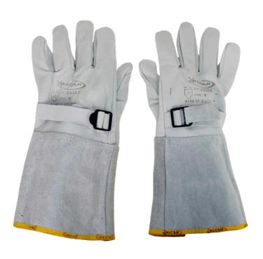 Também conhecida como Luva de Cobertura para Eletricista, confeccionada em couro bovino curtido ao cromo e vaqueta, com palma, dorso e dedos em vaqueta, com punho de raspa, acabamento em viés vermelho, tira para regulagem no dorso com espessura média da raspa em 1,50 mm e espessura média da vaqueta em 1,10 mm, com gramatura 0,0815 gramas/cm² ou 0,815 kg/m² e gramatura 0,0580 gramas/cm² ou 0,580 kg/m², costurada com algodão ou Kevlar. Luva de Cobertura com palma e dorso de Vaqueta, com punho de 20 cm em raspa, acabamento em viés e tira para regulagem no dorso